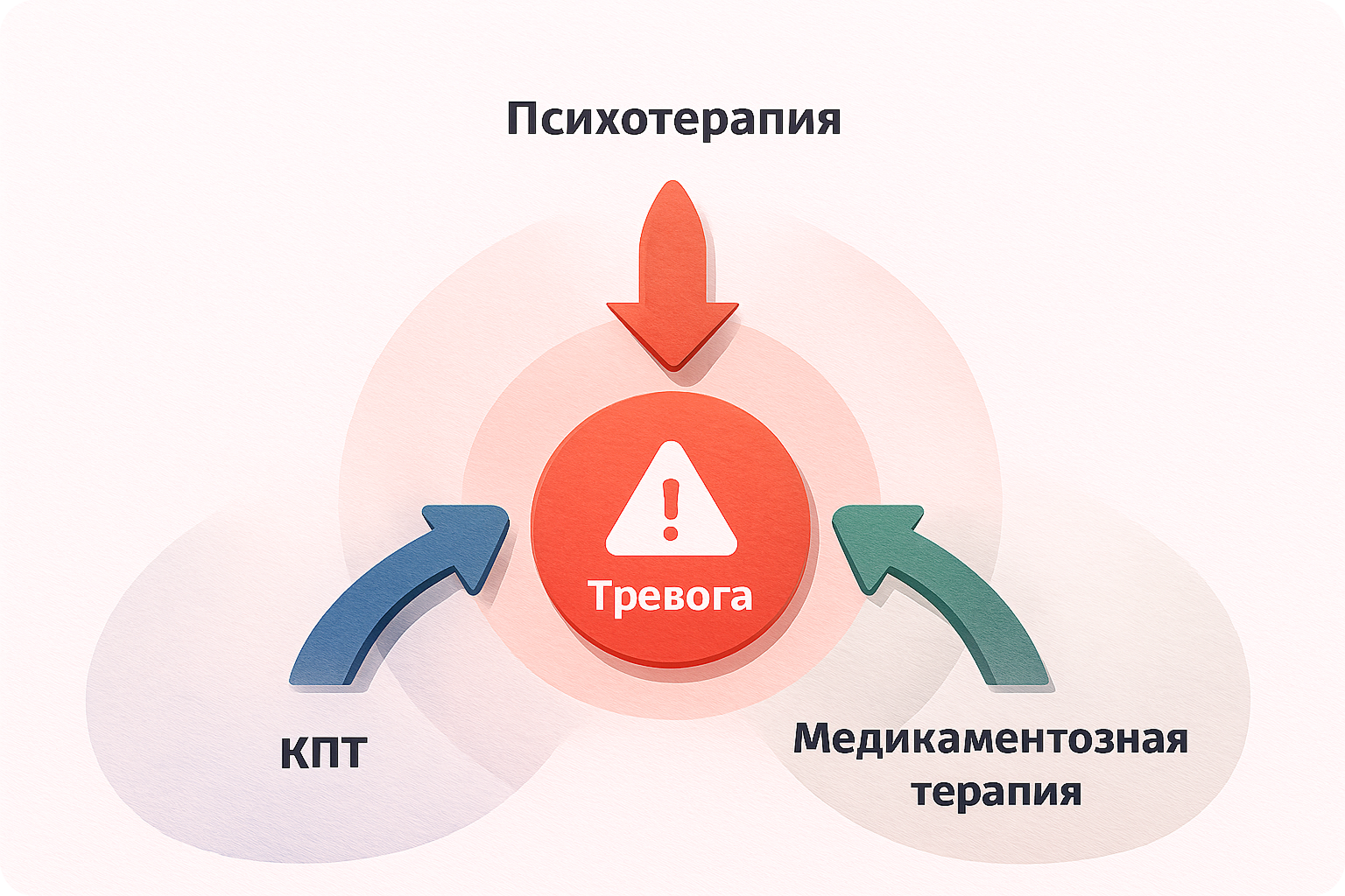 Помогает изменить искажённые шаблоны мышления, которые поддерживают тревожное состояние. Это один из самых действенных психотерапевтических подходов.